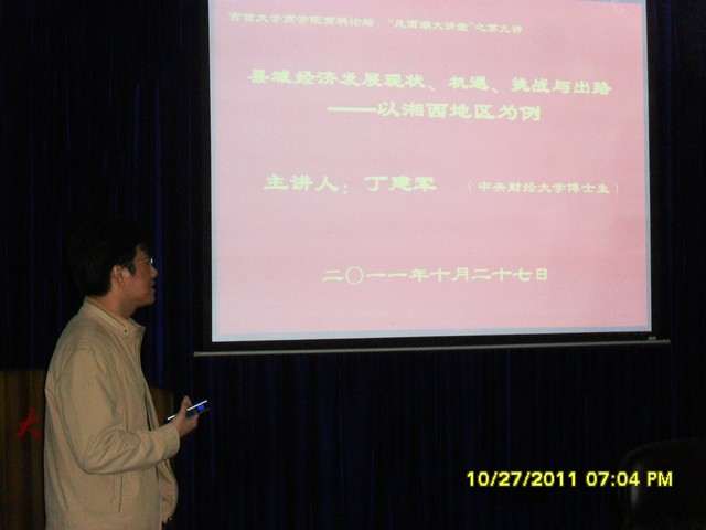 2011年10月27日晚上7:00—9:00,中央财经大学博士研究生、我院青年教师丁建军为2011级研究生和部分本科生作了一堂题为“县域经济发展的现状、机遇、挑战与出路——以湘西地区为例”的精彩讲座。讲座由彭耿博士主持,张琰飞博士、吴雄周博士、向延平博士参加并进行了评论。